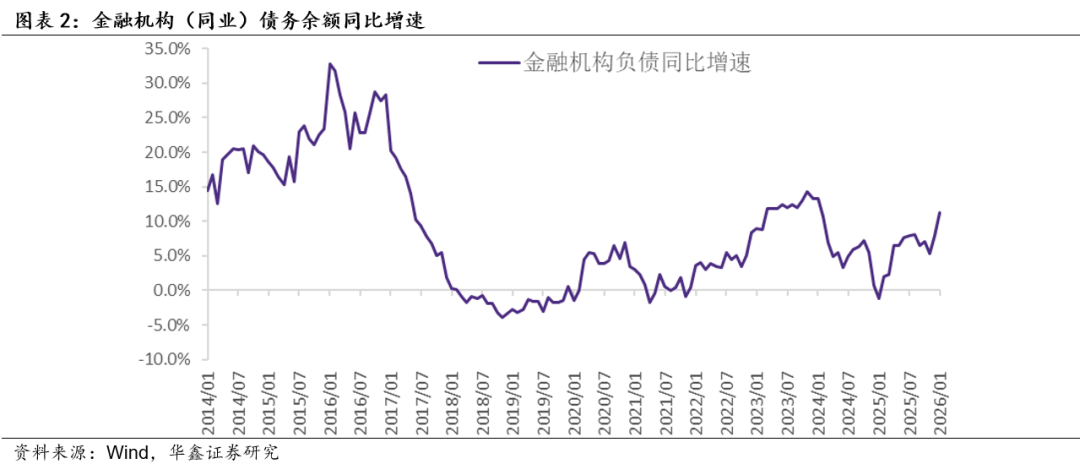 对于非银金融机构而言,我们认为,观察流动性资产充裕与否的关键指标是其存款余额的同比增速。我们在这里选取计入M2的非银金融机构存款,数据显示,2026年1月该数据同比增长34.2%,大幅高于前值23.4%,结合负债数据,我们认为2026年1月非银金融机构流动性边际上或有明显松弛,并带动资金面整体改善。