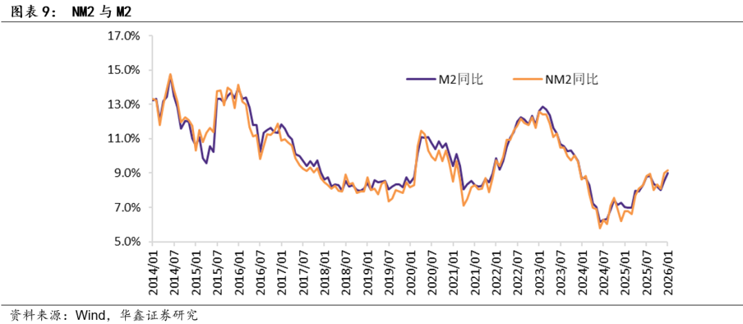 此外,根据标准M2的定义,即四部门(家庭、政府、金融机构、非金融企业)持有的可动用的现金和存款,我们构建了新的广义货币供给指标(NM2),数据显示,其与M2的走势相似,但2017年以来绝对水平更低,反映了金融去杠杆力度更大的影响。不过,2018年7-12月,上述情况略有逆转,对应实体部门转而成为去杠杆的重点。2019年以来,政府逐步带动实体部门增加杠杆,货币整体中性,抑制金融杠杆。在2020年3-5月,上述情况发生逆转,金融机构加杠杆的速度超过实体。在2020年6月以来政策的调控下,NM2持续表现偏弱,2022年2-4月,与针对疫情的放松有关,NM2同比增速连续高于M2。2022年5月,上述情况出现逆转,NM2同比增速稳定在10.9%,与前值持平,低于同期M2同比增速(11.1%),这也对应着货币政策在5月出现边际收敛。2022年7月之后,NM2同比增速在2024年2月首度超过M2同比增速,但3-8月快速回落至低于M2的水平,9月NM2同比增速回升至7.1%,高于同期M2同比增速(6.8%),10月NM2同比增速继续上升至7.5%(仍略高于同期M2同比增速,连续两个月NM2同比增速高于M2,这预示着未来货币政策边际宽松空间已微乎其微。2024年11月之后,NM2同比增速持续低于同期M2同比增速的情况在2025年5月出现变化,5-8月NM2同比增速持续高于同期M2。2025年9月NM2同比增速大幅下降至8.0%,低于同期M2;但10-12月则连续高于同期M2,2026年1月NM2同比增速上升至9.1%,继续高于同期M2。我们相信按照金融让利实体的思路,NM2同比增速后续大概率还是会低于M2同比增速,这也意味着货币政策在目前情况下进一步松弛的空间已经非常有限。