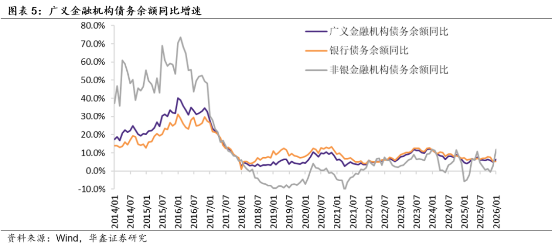 我们对第一部分中金融机构的债务口径进行拓展,截止2026年1月末,广义金融机构债务余额168.6万亿,同比增长6.5%,低于前值4.9%。其中,银行债务余额138.0万亿,同比增长5.3%,前值5.4%。分结构来看,各个科目余额同比增速涨跌互现;对央行负债同比下降至18.0%,前值同比增长31.7%,这和央行资产端对其他存款性公司债权的表现一致。非银金融机构债务余额30.7万亿,同比增长11.9%,前值同比增长3.0%,银行资产端对金融机构债权余额增速亦转而上升。