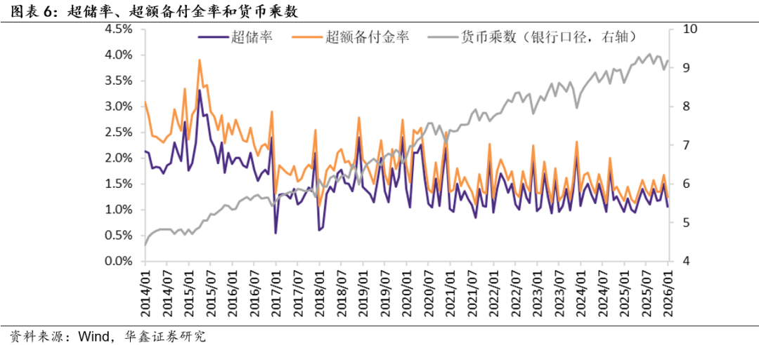 我们再来看金融机构的资产端,一般而言,在流动性资产充裕背景下的去杠杆称之为主动去杠杆,对应流动性边际松弛;在流动性资产紧张背景下的去杠杆称之为被动去杠杆,对应流动性边际收紧。对于银行而言,我们认为,观察流动性资产充裕与否的关键指标是超额备付金率,其与货币乘数基本保持负向相关关系(除降准形成的干扰之外)。2026年1月银行超额备付金率录得1.2%,前值1.7%;2026年1月货币乘数录得8.68,前值8.45。综合来看,2026年1月,我们衡量货币政策的三大数量型指标——基础货币余额增速、金融机构负债增速、超额备付金率——两降一升(金融机构负债增速上升),我们认为,2月虽然货币政策难言松弛,但非银金融机构带动资金面有所改善、高点大约形成在2月9日附近,春节前后资金面有明显的边际收敛和松弛波动。3月资金面大概率边际收敛。结合其他数据来看,2月货币政策边际上有所松弛。