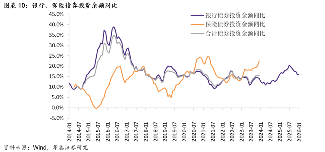 2026年1月,银行债券投资余额同比增速录得16.0%,高于前值15.8%,资产余额增速亦有所上升。